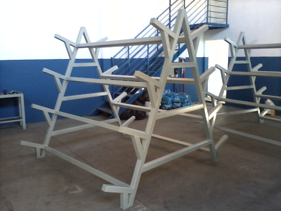 Estrutura em aço carbono SAE 1020 soldada em MIG. Projeto desenvolvido conforme o projeto do produto do cliente. O Rack para armazenamento de Rodeiros de 4.000kgs empilhados em três totalizando o dimensionamento de cada peça para um peso de 36.000kg.